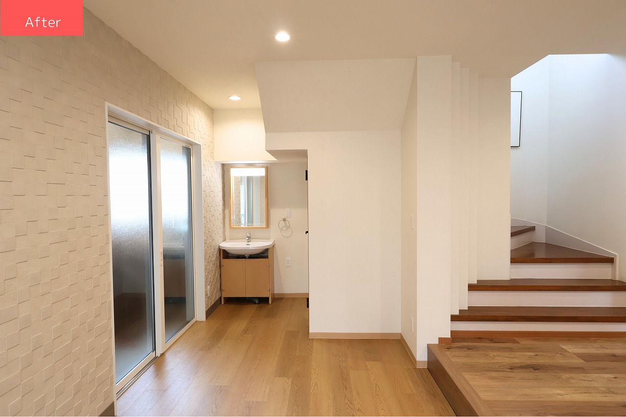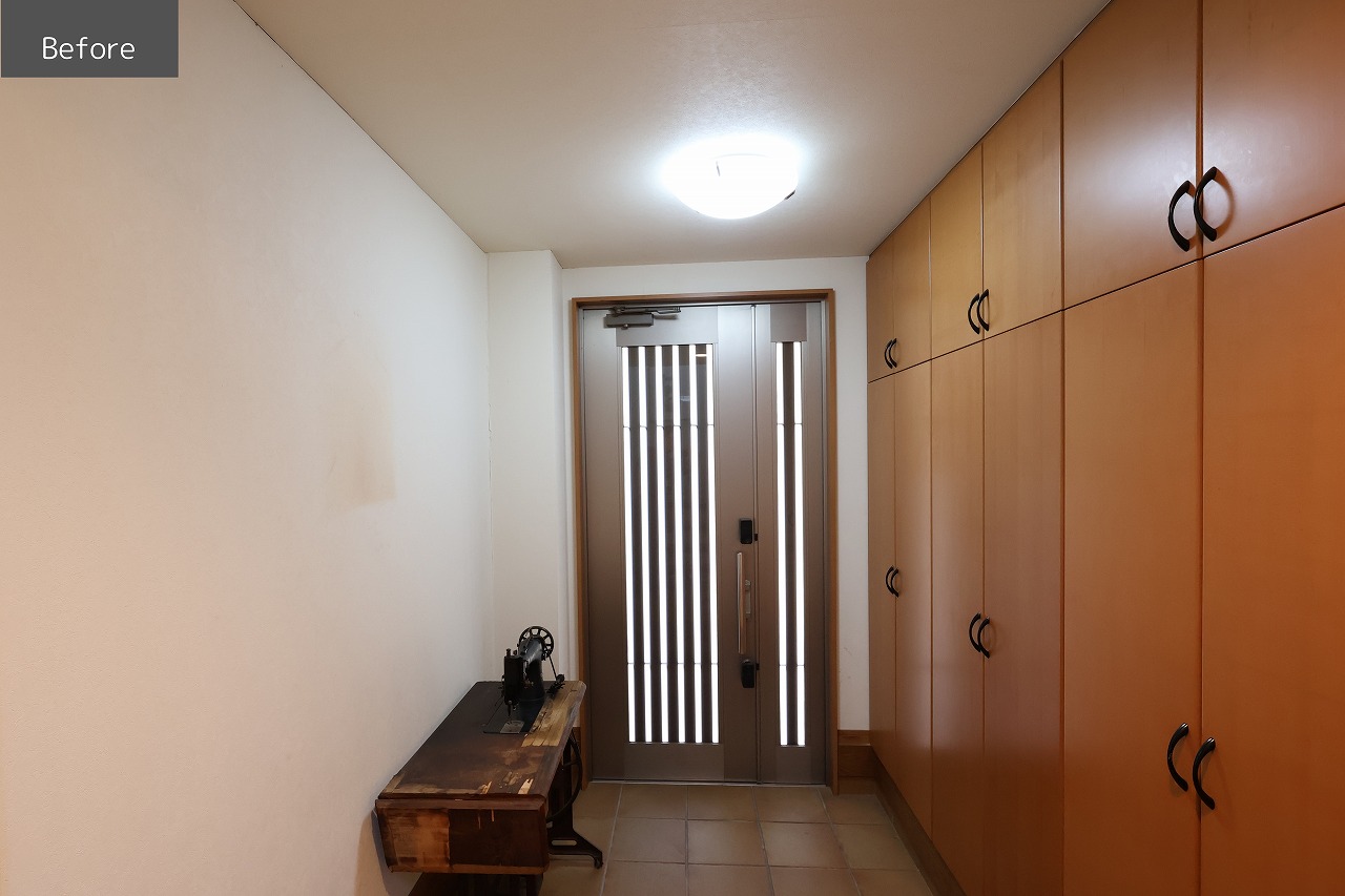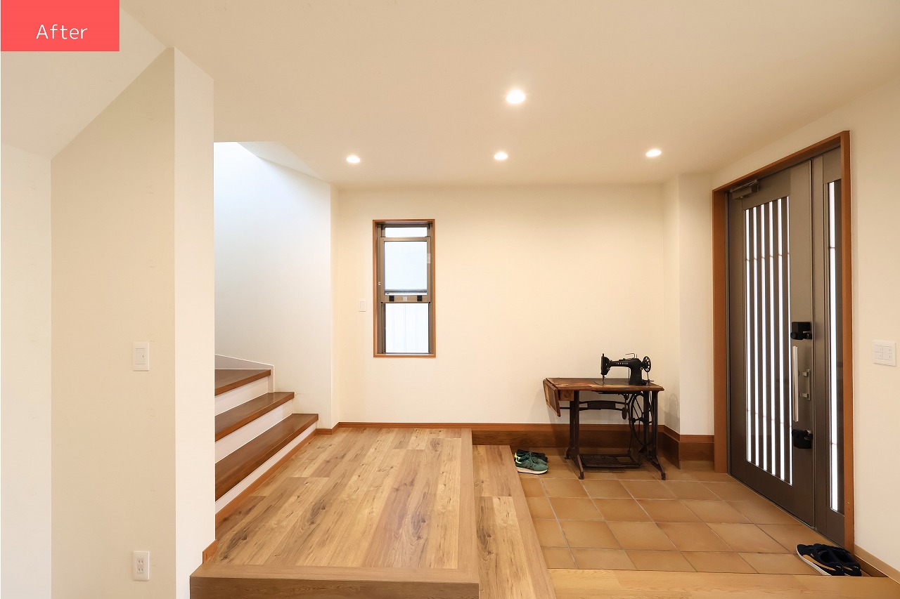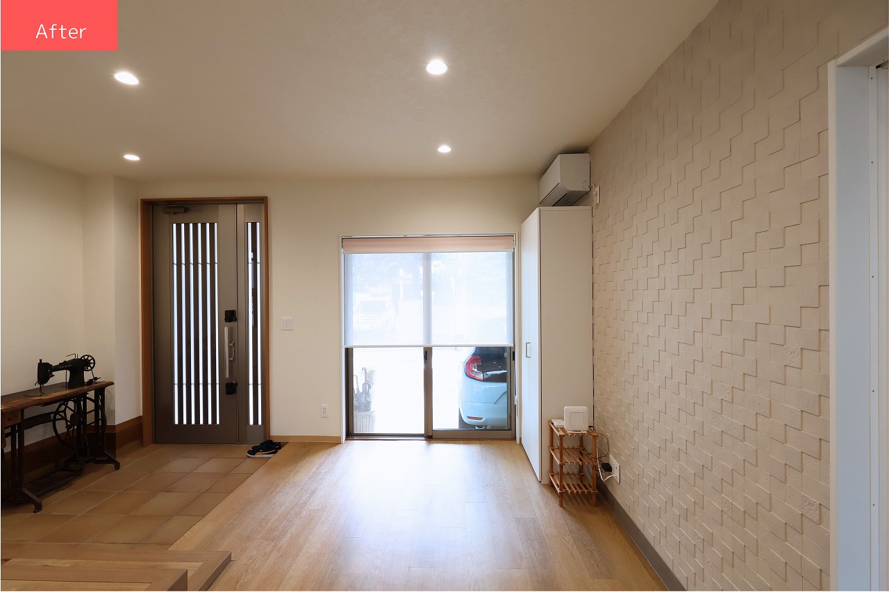 玄関の物入れをなくして隣のお部屋とつなげ、開放感のある広々とした空間にリフォームしました。
