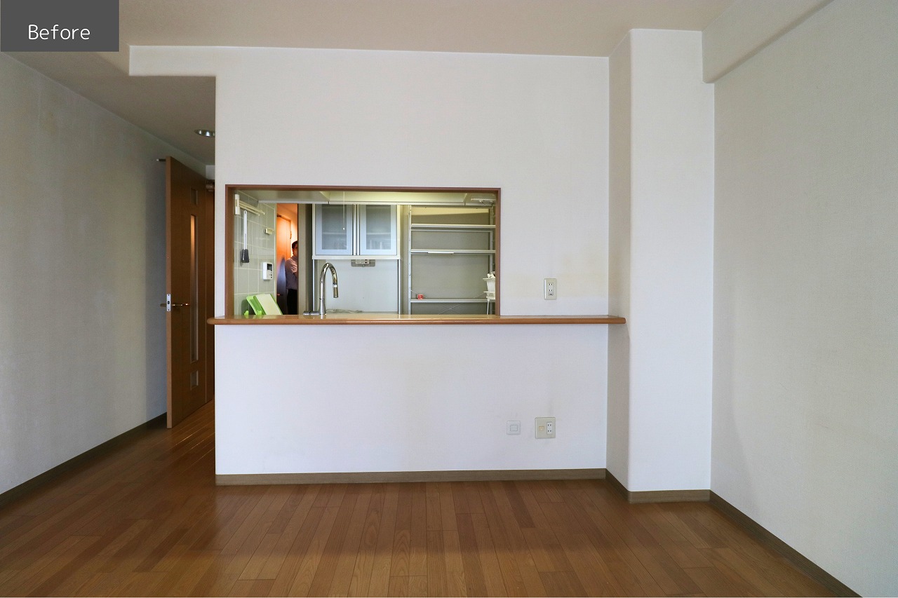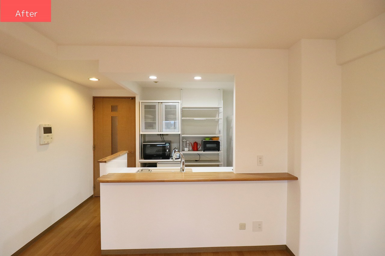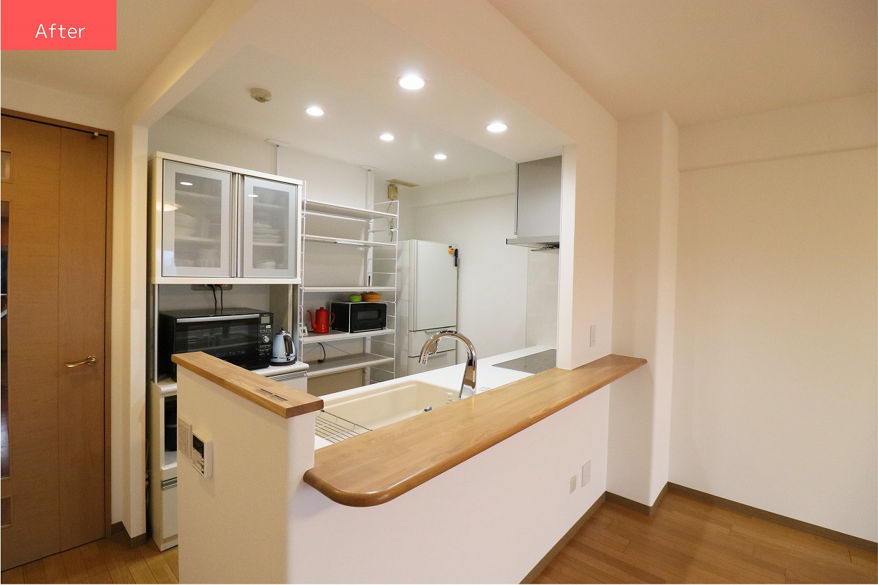 閉塞感のあったキッチンは、横の壁を取り払、開放感を実現しました。